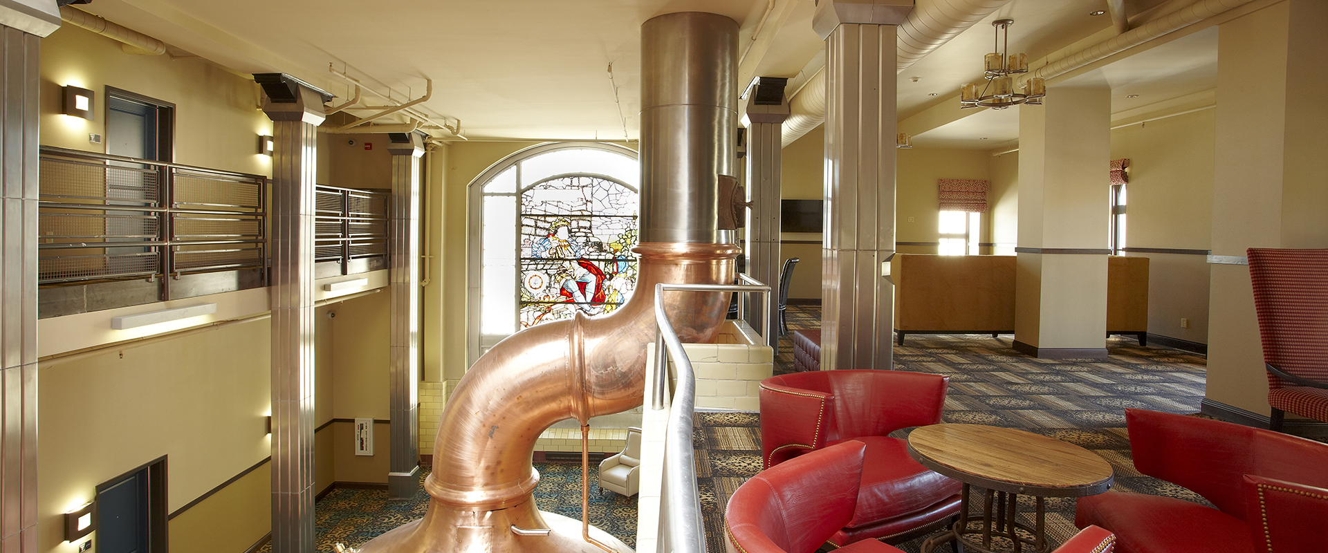 Nestled at the heart of the hotel, our Kettle Atrium is a captivating space that highlights the building's historical elements, featuring iconic copper brewing kettles and a stunning stained glass window of King Gambrinus. With a unique wow-factor, this space accommodates up to 100 guests, making it the perfect choice for various occasions such as receptions, cocktail hours, dinner events, and more. Experience the charm of our Kettle Atrium, where original features and an inviting atmosphere converge to create a memorable backdrop for your special events.